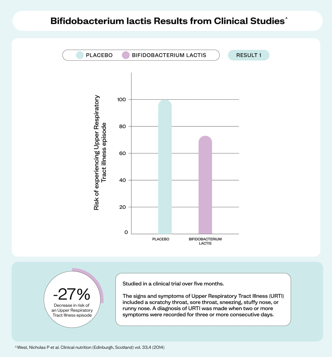 In a study published in Clinical Nutrition, (Bifidobacterium lactis),demonstrated a significant benefit to Upper Respiratory Tract illness (UTRI) in healthy physically active adults. The study was conducted in Australia by the GriffithHealth Institute at Griffith University and the Australian Institute of Sport. The study,West et al. Clinical Nutrition 2014, measured the effect of strain specific Bifidobacterium lactis on healthy, active men and women over a five-month period. Results showed the prevalence of URTI was less than that of the placebo group by 27%.