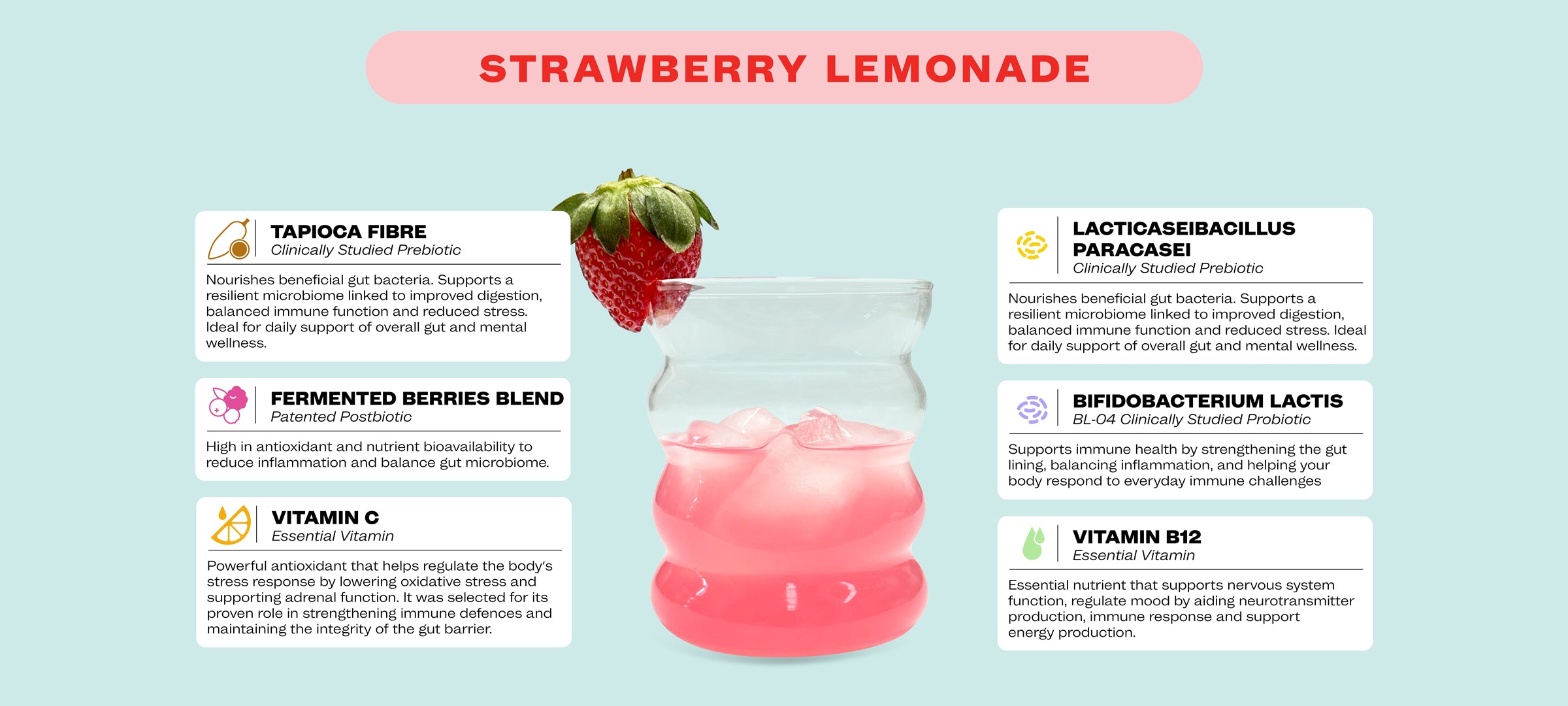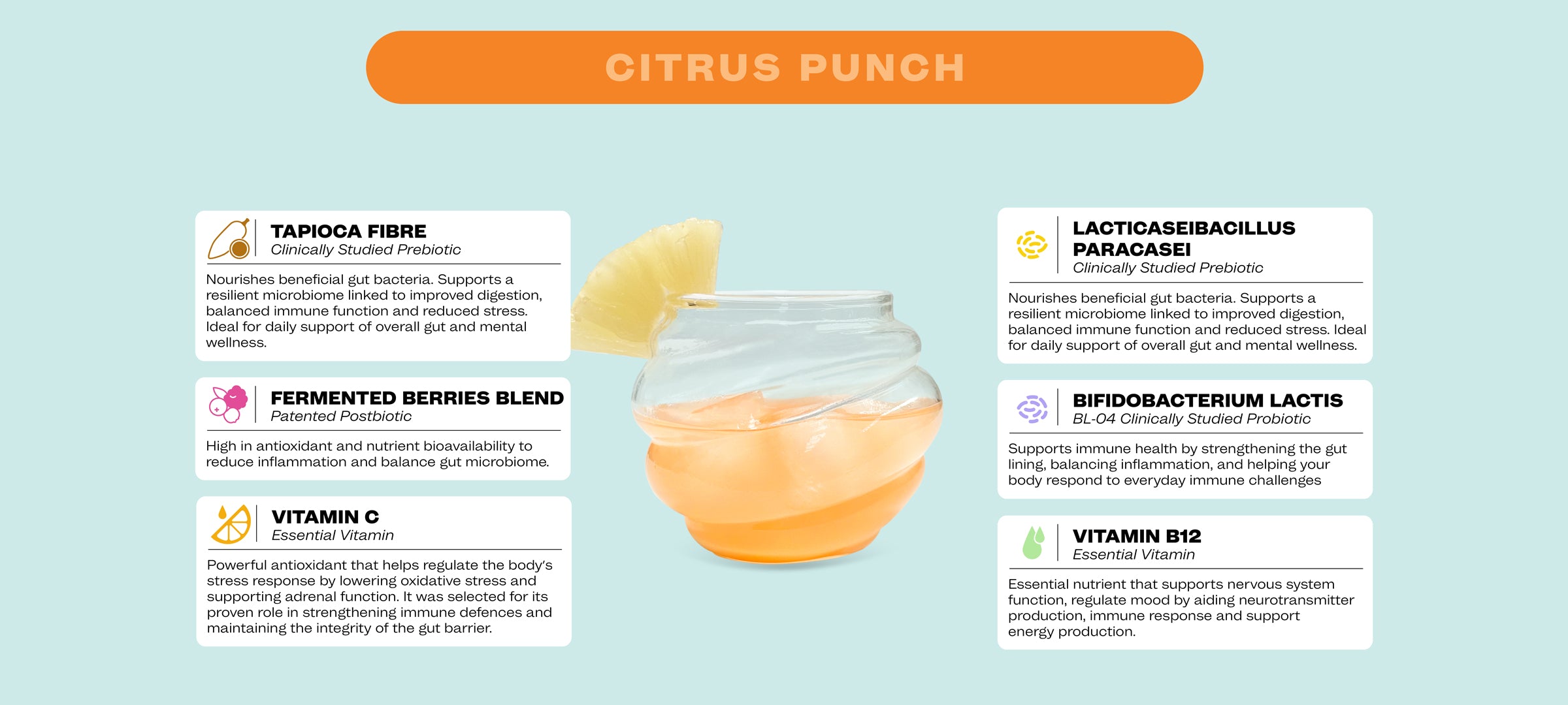 This triple-biotic formula with 3 clinically proven ingredients that combines prebiotics, probiotics, and postbiotics to nourish, populate, and support a thriving gut microbiome—your body’s control centre for stress, mood, immunity, and overall wellness. As well 2 essential vitamins - B12 and C - for energy and overall wellbeing support.