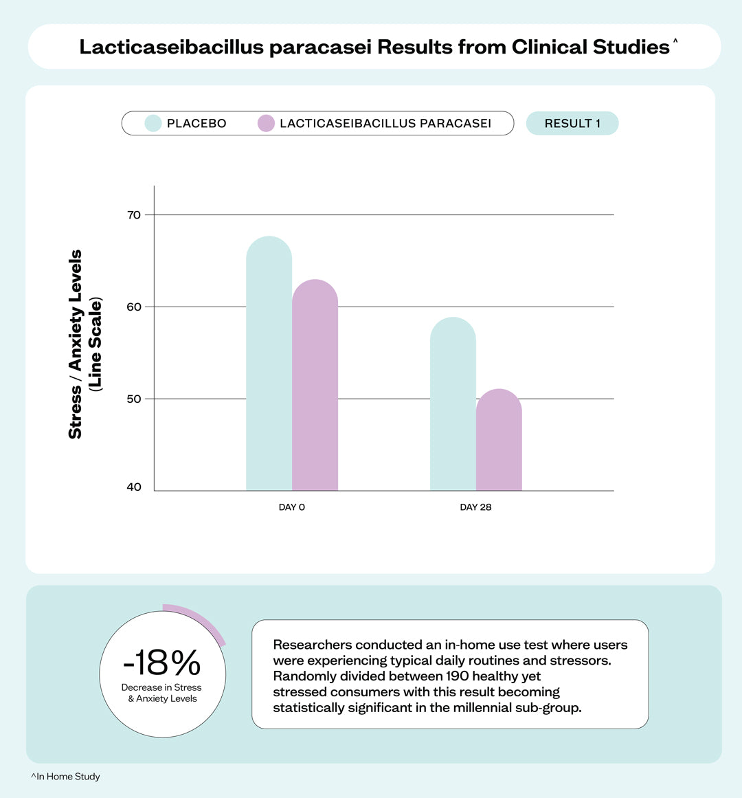 A clinically proven probiotic with 21+ clinical trials (double blind & placebo-controlled study) as a specific strain that enhances mental wellness by promoting a healthy microbiota balance in the gut.