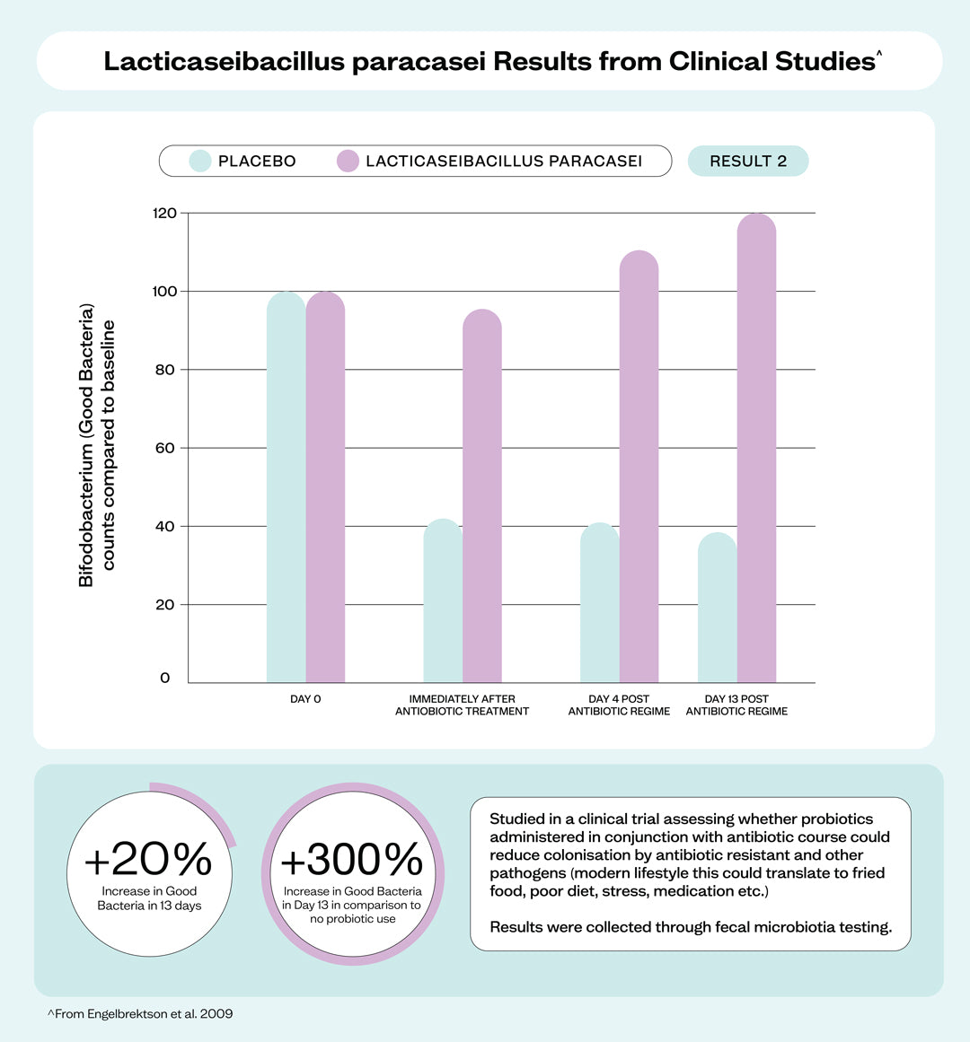 Lacticaseibacillus paracasei has been cited in more than 65 scientific publications, including more than 21 clinical trials. It has a long history of safe use, is well suited for intestinal survival, and has strong adhesion to intestinal cell lines and pathogen inhibition